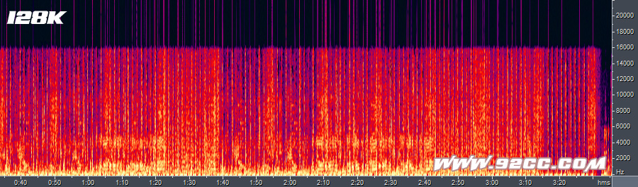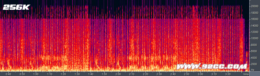 256K音质的MP3频谱坐标轴同样也是在16000衰减,再向上有大量相对饱和的线能达到20000。