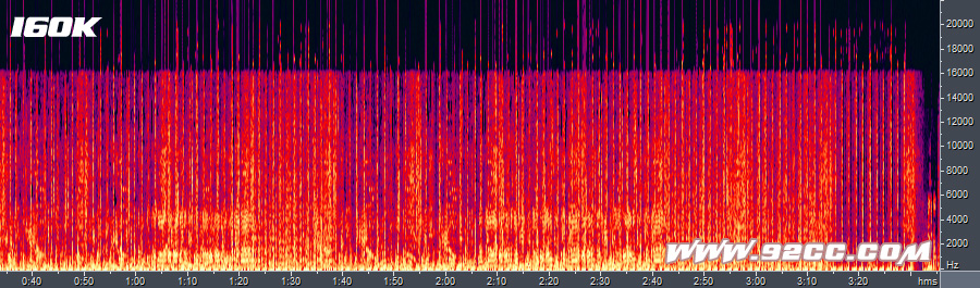 160K音质的MP3频谱坐标轴在16000衰减,再向上有微量的线能达到20000。 (点击图片查看大图)