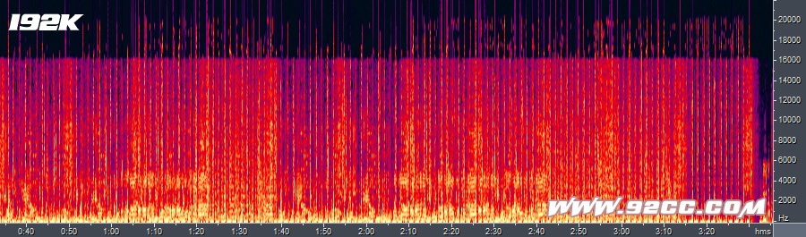 192K音质的MP3频谱坐标轴同样也是在16000衰减,再向上有少量的线能达到20000,数量要比160K的多一些。 (点击图片查看大图)
